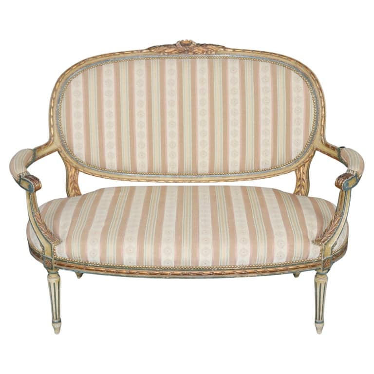 Antique French Louis XVI Style Paint Decorated & Gilt Carved Settee
