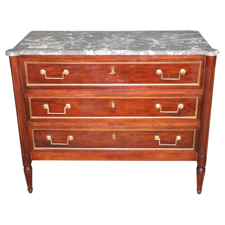 Antique French Louis XVI Style Brass Mounted Marble Top Commode