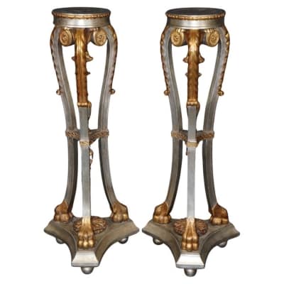 Pair Silver and Gold Leaf Carved Walnut French Louis XV Style Pedestals Stands