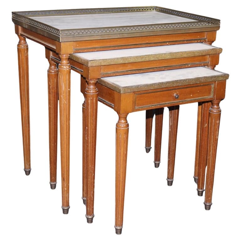 Set of 3 French Louis XVI Style Brass and Walnut White Carrara Marble Tops