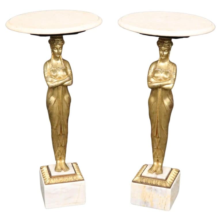 Pair of Tall Gilded Figural Marble Top Neoclassical French End Tables