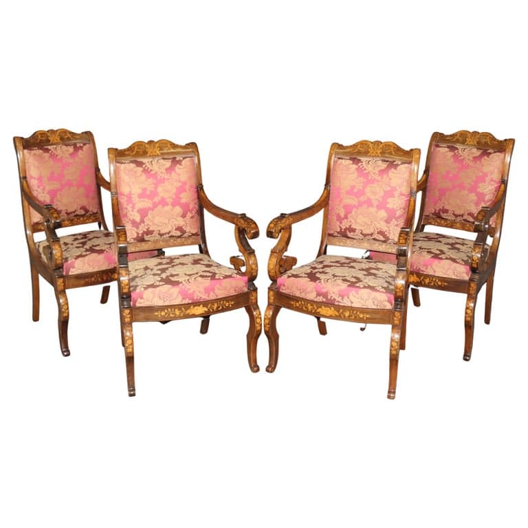 Rare Set of 4 Dutch Marquetry Inlaid Walnut and Tulipwood Armchairs in Damask