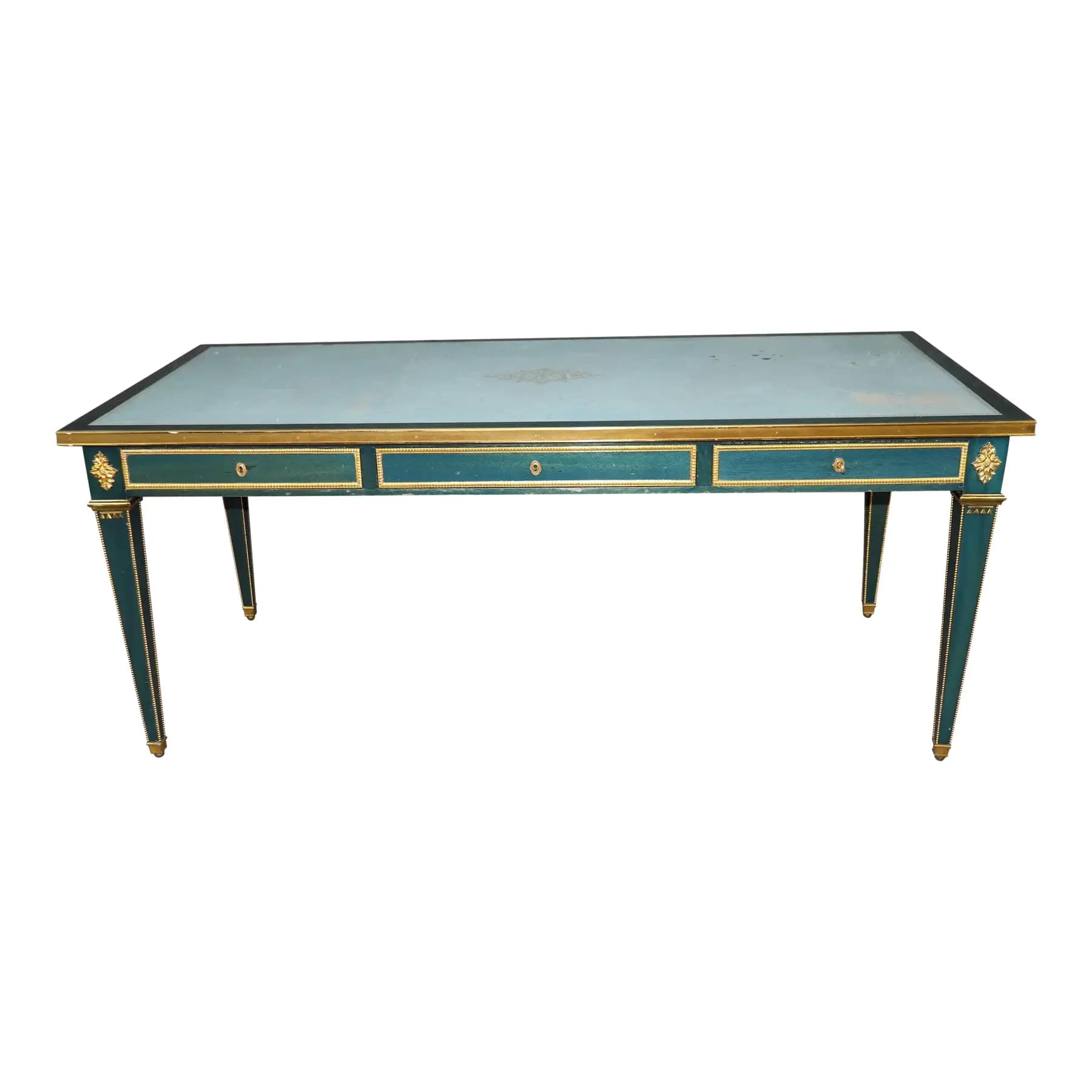 Dore’ Bronze Mounted Signed Maison Jansen Leather Blue-Green Bureau Plat Desk