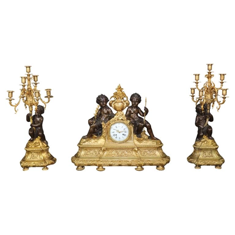 19th Century Figural French Bronze Mantel Clock Set Millard d Paris Japy Freres